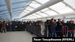 В миграционный центр, расположенный в 65 километрах от Москвы, группа сотрудников посольства и корреспондентов прибыла в 11.00 утра. Мы остановились возле приемного центра, где необходимо получить талон. В этот момент возле центра в очереди стояло свыше 1,5 тысячи человек. Среди них был и наш соотечественник Алмазбек Момунов. Он уже успешно сдал тестирование по русскому языку и истории, теперь стоял в очереди на сдачу медицинских анализов.