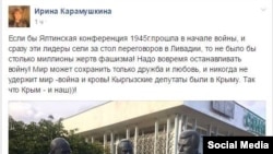 В кыргызском интернет-пространстве активно обсуждали поездку кыргызстанских парламентариев в Крым. Критику вызвал пост Карамушкиной в «Фейсбуке», в конце которого она написала: «…Кыргызские депутаты были в Крыму. Так что Крым – и наш))!».